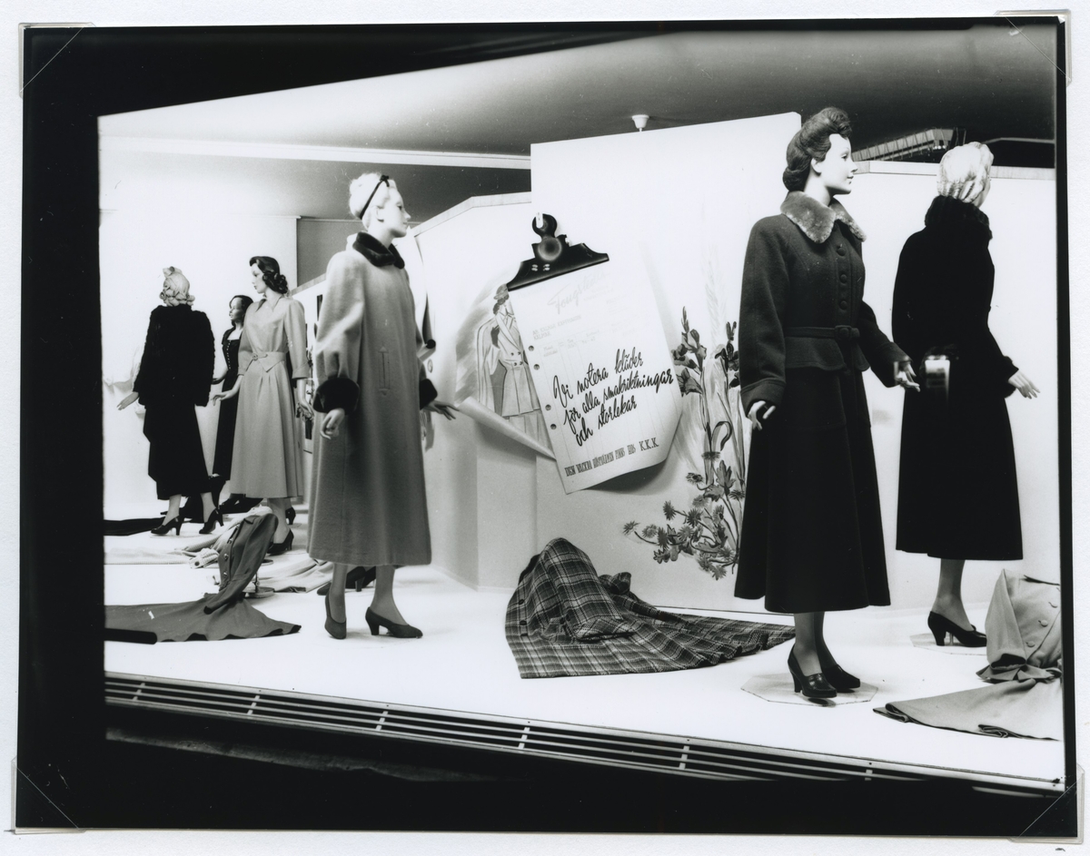 Kalmar Kappmagasin AB. Klädaffär, skyltfönster med skyltdockor.