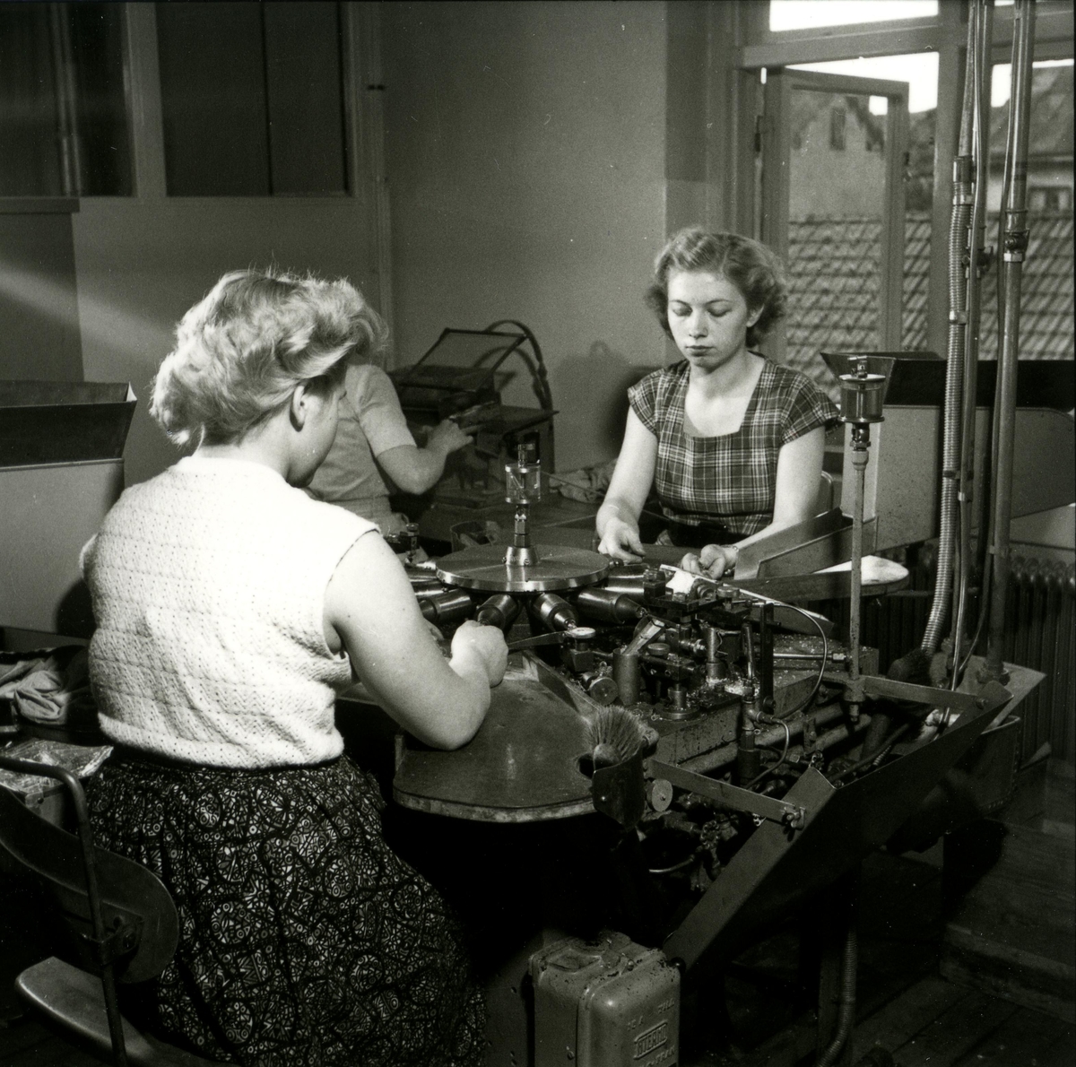 Arbetare på Lumalampan. Volframtråden snos till spiraler som blev glödtråd i lamporna.