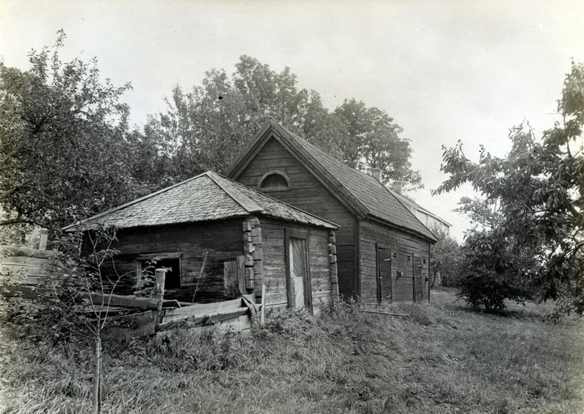 Trädgården: (planen .. 14,15) Till vänster gammal fatbur av korsknutat timmer under toppigt tak. Till höger magasin i en botten. Timmer med avsågade knutar.