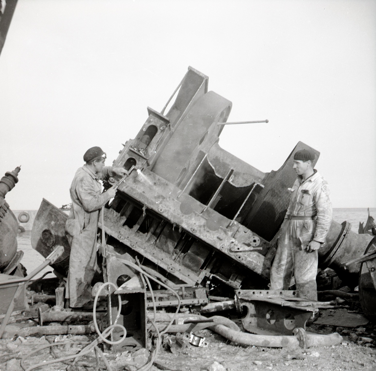 Titel: Bärgningar vid Gräsgård. Delar av vraken efter de tre tyska örlogsfartyg som gick in i en svensk mnspärr och sjönk 9/7 1941 bärgas.