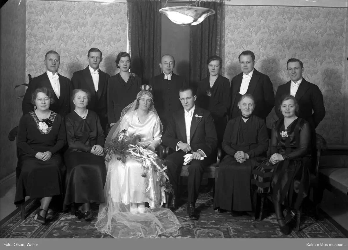 Gruppbild på brudpar och bröllopsgäster, beställare: Gust. Johannesson, Stagneliigatan 25, Kalmar.