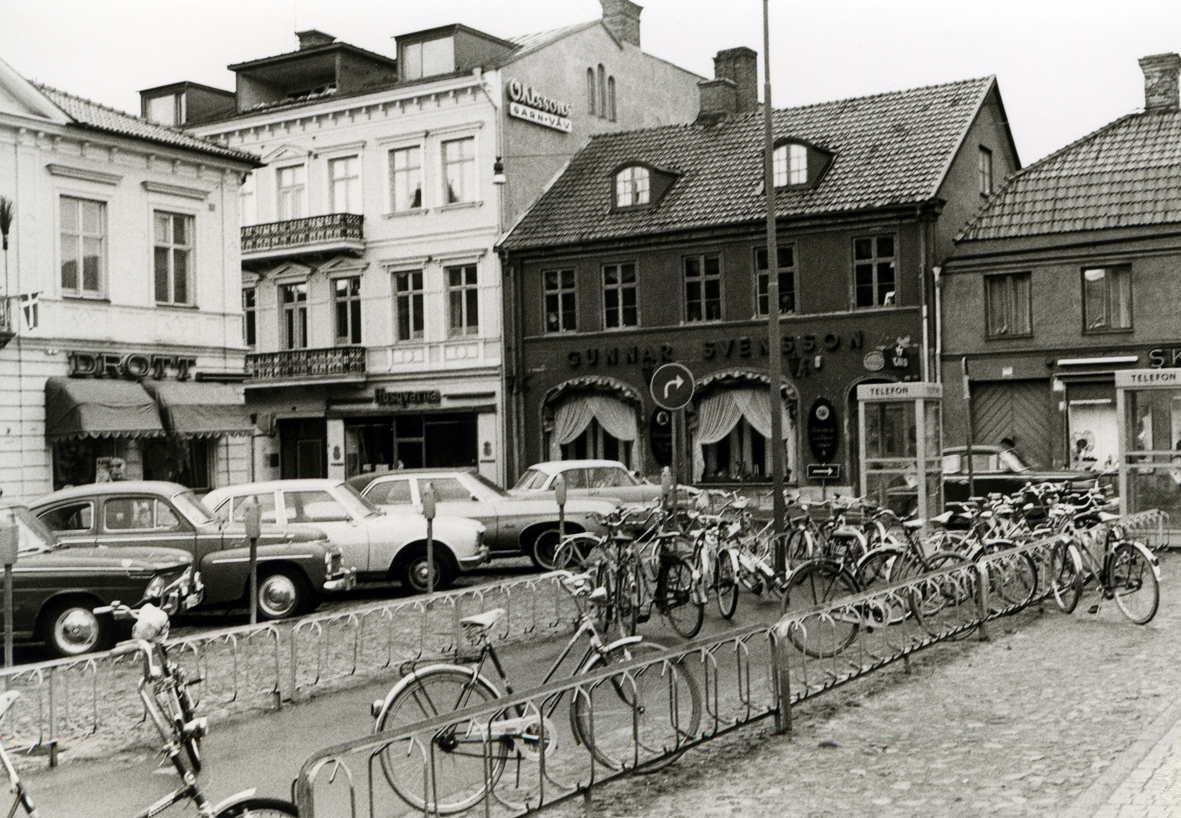 Kvarteret Guldsmeden från Larmtorget. Till vänster kvarteret Blockmakaren. Cyklar vid cykelställ och bilar som är parkerade.