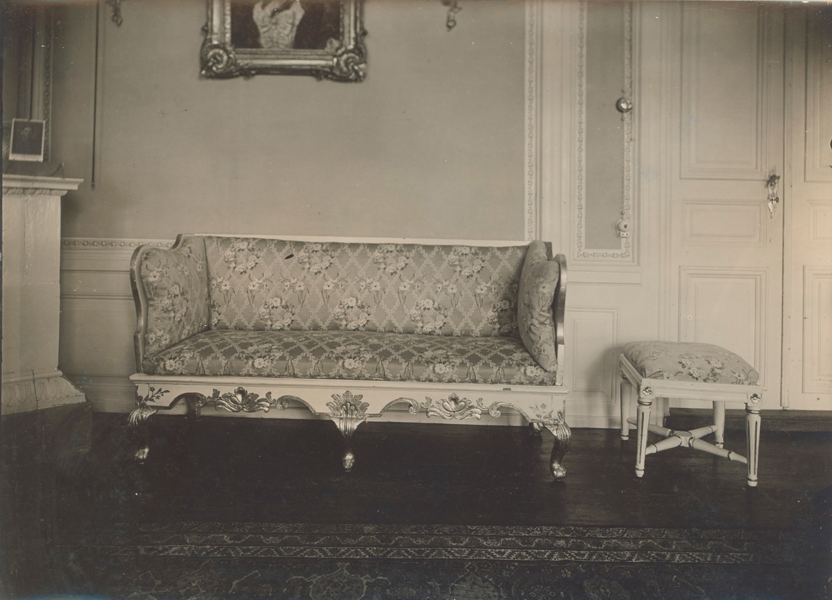 Värnanäs herrgård. Salongen på övervåningen: Soffa, senbarock, snidad sarg och fötter, gavlarna snidade med ornament utmed kanten och en blomma i kruka mitt på. Nu i vitt och guld. Gustavianska taburetter signerade EÖM.