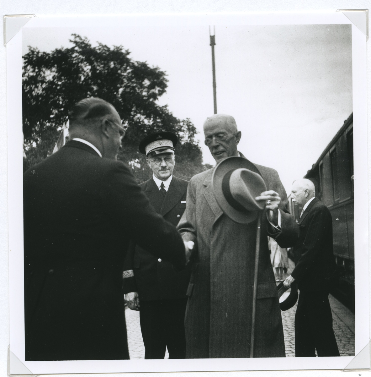 Konung Gustav V hälsar på Birger Jeansson. Mellan dem ses landshövding Arvid Lidén.