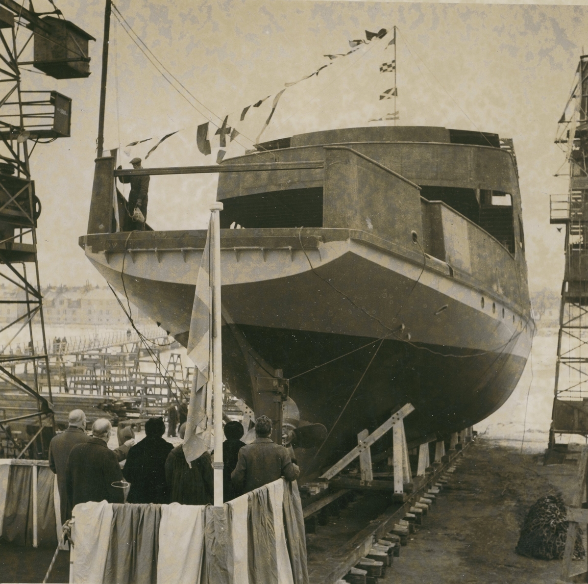 Sjösättning av ett fartyg på en stapelbädd på varvet i Kalmar.