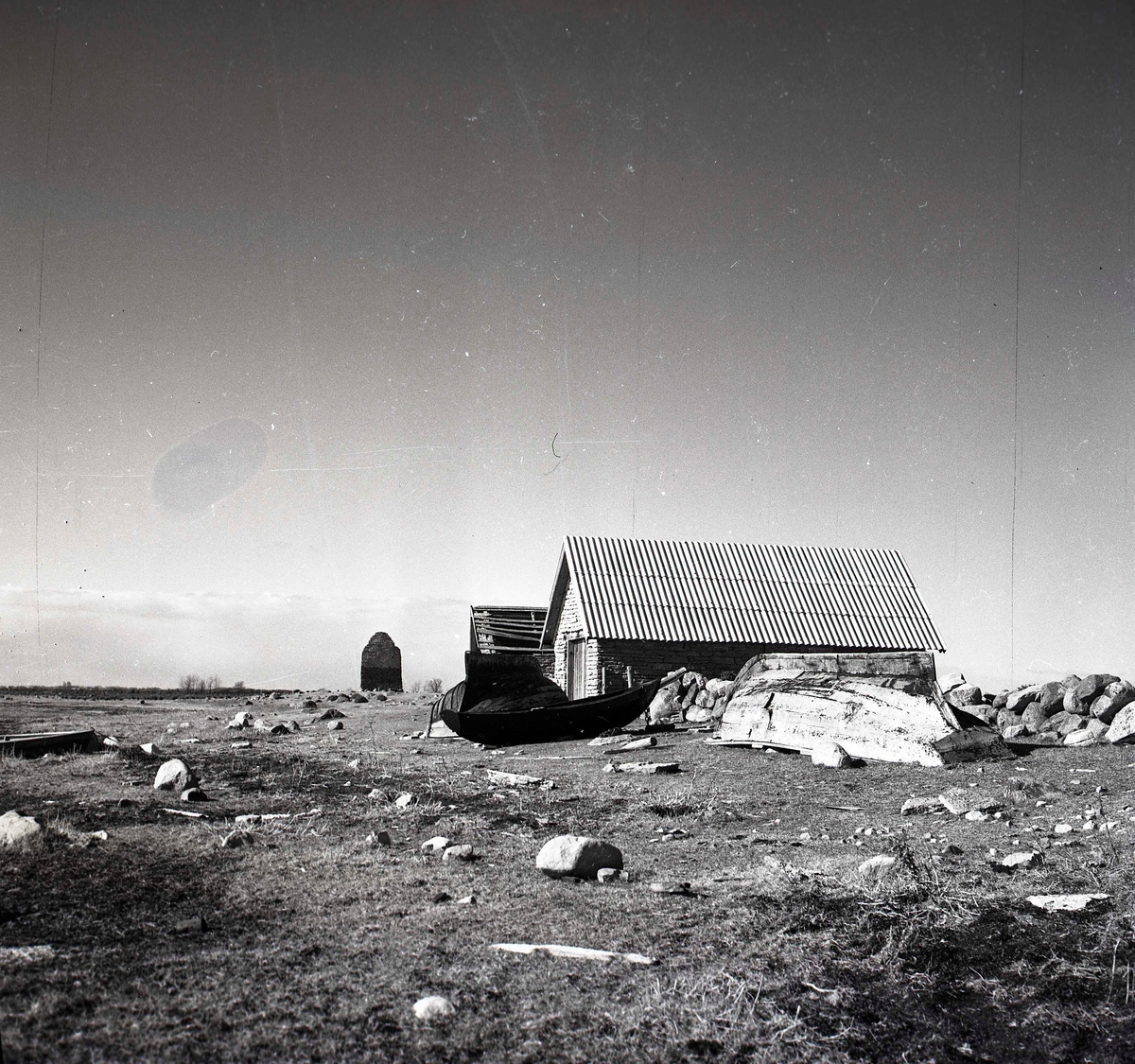 Titel: Hallnäs sjöbodar 7/4 1957. På sydspetesen av Hallnäs udde finns fem sjöbodar, varav den längst i söder är uppförd av kalksten och trä. I anslutning till de befintliga bodarna finns flera äldre sjöbodtomter idag omgivna av stenbundna jordvallar. Strax norr om bodarna, i de betade sjömarkerna, står ett sjömärke av kalksten, sju meter högt, med smalare, rundad överdel. Det till storleken imponerande byggnadsverket uppfördes 1868 och kallas av lokalbefolkningen för "Hallnäskärringen". Strax söder om udden finns Hallnäs läge, platsen för en tidigare hamn, som är övergiven sedan 1800-talet. Källa: Svenska Pärlor - Öland (Svenska turistföreningen och Länsstyrelsen i Kalmar län)