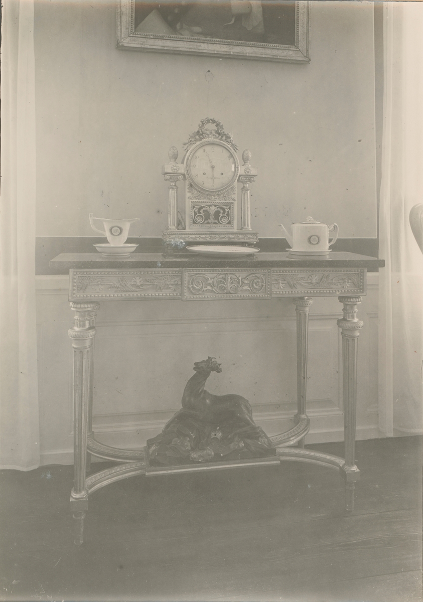 Värnanäs herrgård. Förmaket i Övervåningen: Konsolbord, sengustavianskt, förgyllt. Sargen med snidad ornering. Skiva i porfyr. Krysset har på mitten en rektangulär platta, förgylld, på denna är placerad en hjort av mörkmålad gips, ett exemplar av den skulptur som ligger som krön på det av Jean Eric Rehn ritade myntskåp. Bordsur, sengustavianskt, av snidat trä, förgyllt och målat gulvitt, signerat "EURLING, STOCKHOLM".