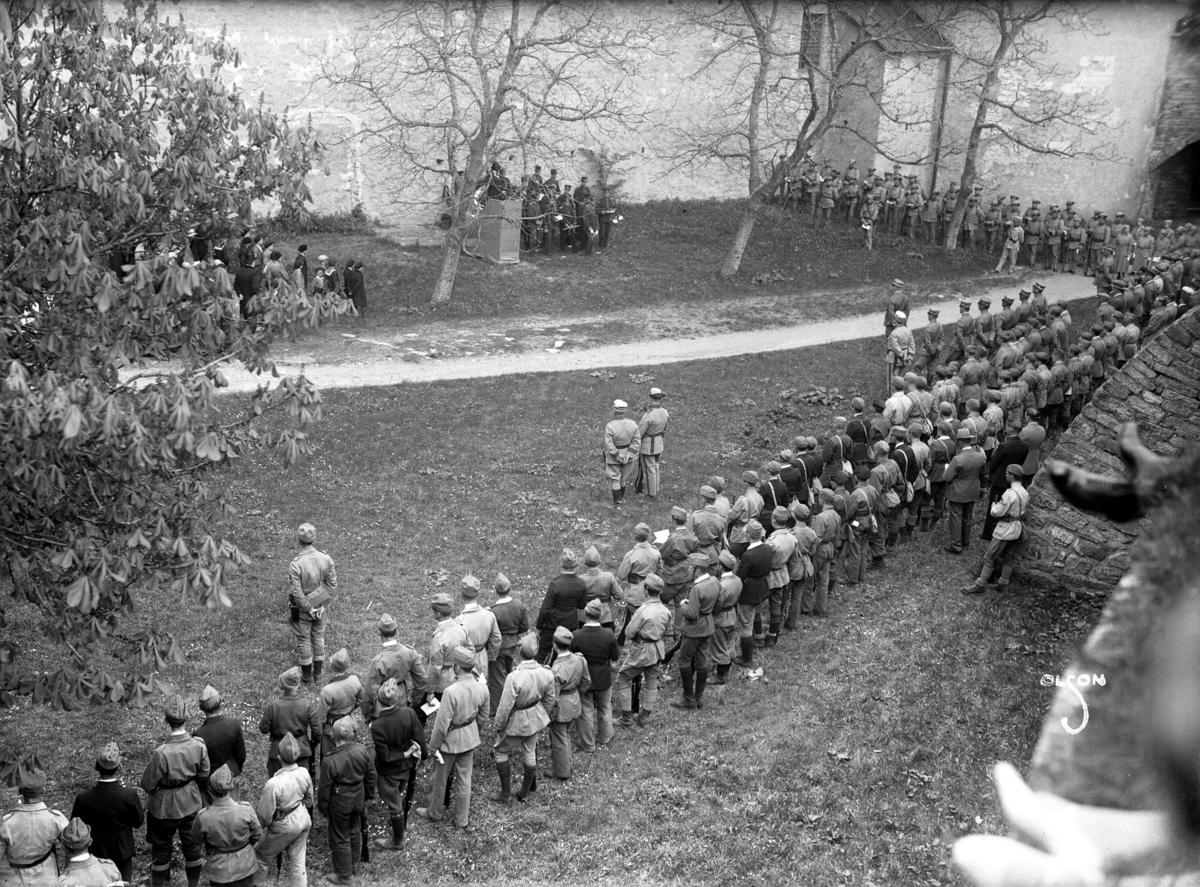 Militärer med musikkår på slottets borggård. Beställare: Landstormen.