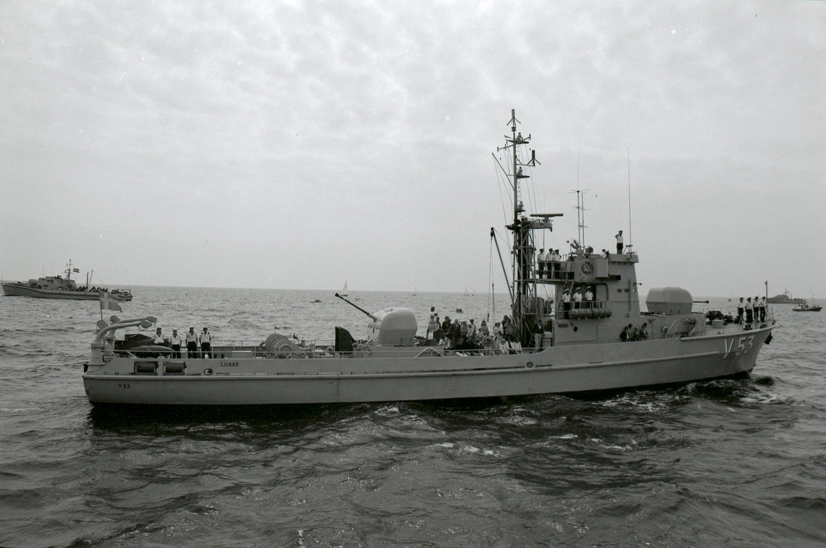 Minsveparen HMS Tjurkö, numera ägd av kungahuset, i Tall Ships race, Karlskrona 1980