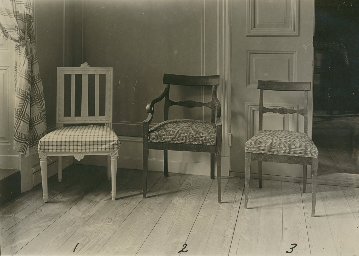 Övre våningen, gästrum på Blekhems herrgård. 1. Gustaviansk stol med druvklase i krönet. Vit. 2. Länstol av alm. 3. Stol av alm, samma typ som länstolen.