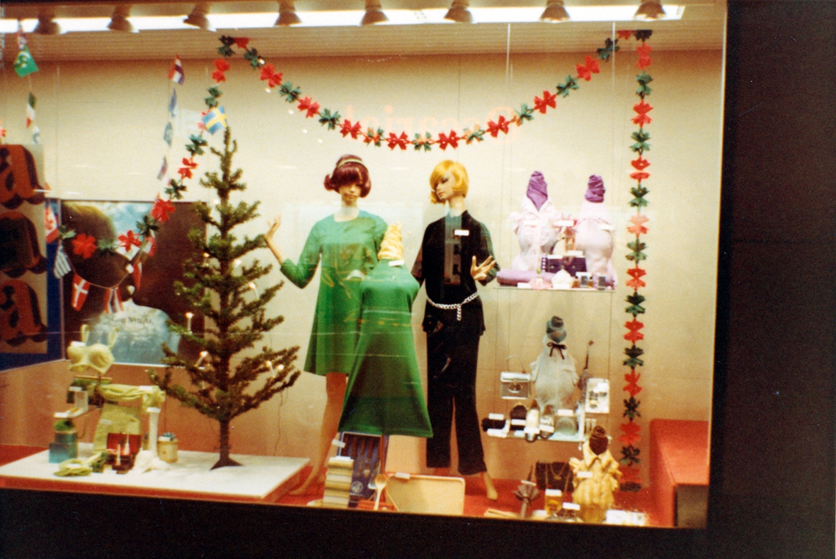 Julskyltning med dammode i Domus fönster, i Kalmar, 1967.