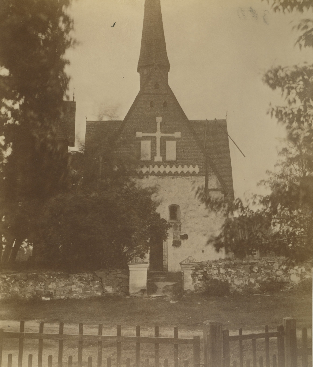 Dalhems gamla kyrka. 1874 före rivningen. Sydsidan med vapenhuset. Mellankyrkans gavel med blinderingar. Till vänster Fagradalskyrkan som var en del av kyrkan.Till höger koret. I bakgrunden till höger klockstapeln.