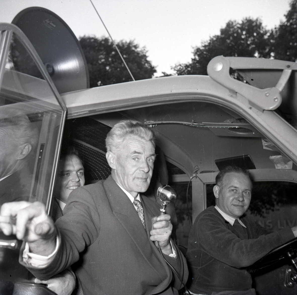 Valet 1954. Användande av fordon med högtalarutrustning. Bror Hellberg, Bror Svensson, Albin T. Forsman och valarbetare.
