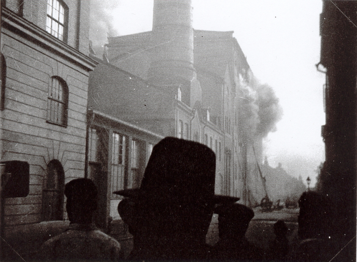 Fasaden mot Södra Långgatan när Ångkvarnen stod i brand.