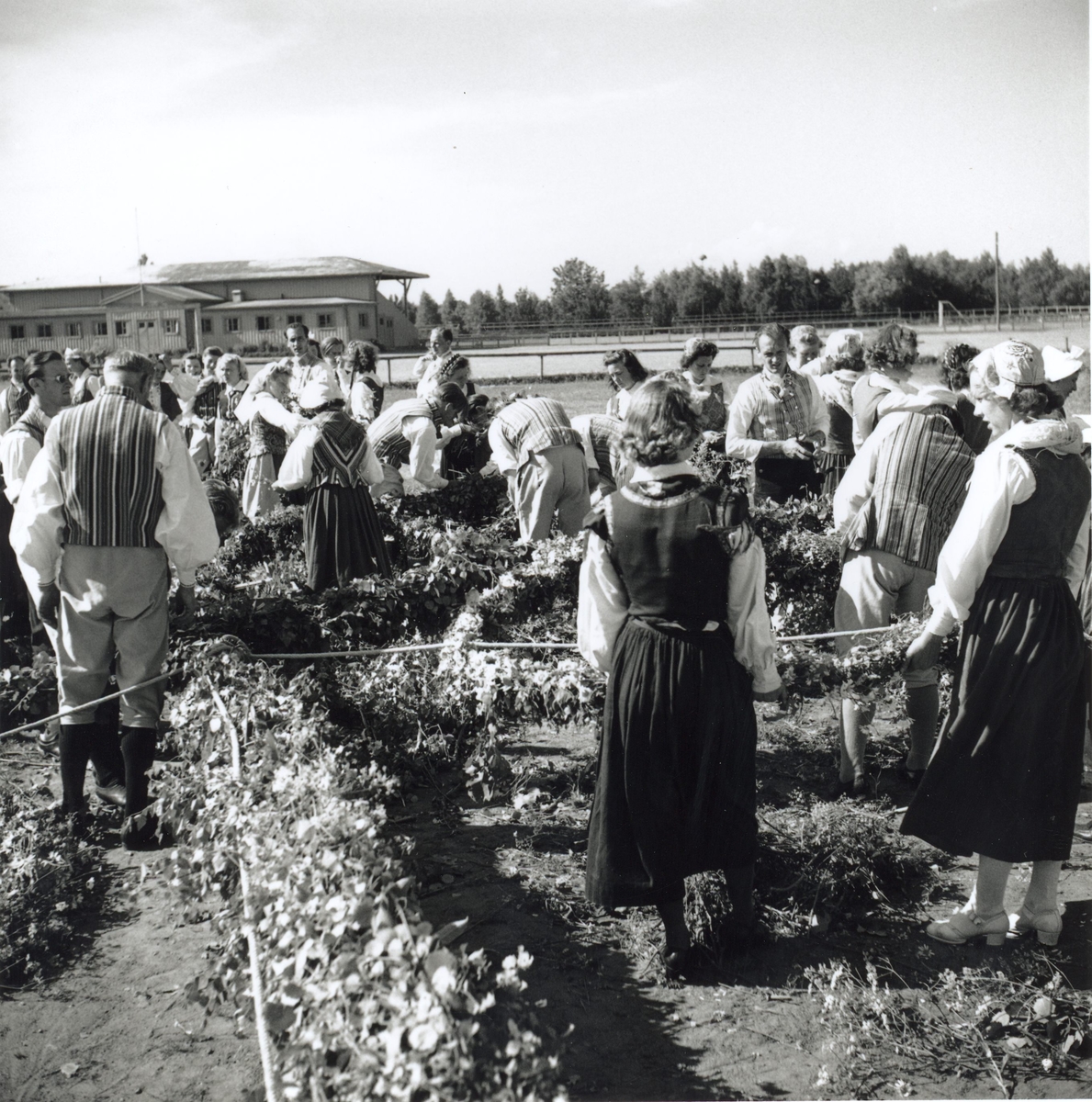 Resning av midsommarstången under hantverksmässan i Kalmar 1947.