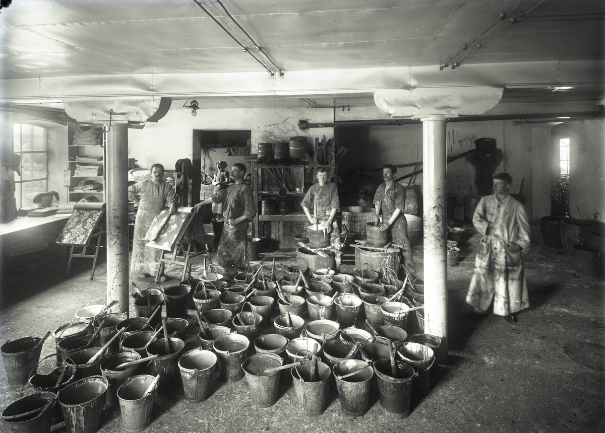 Interiör från färgblandningssalen på J. P. Johanzon & Co Kalmar Tapetfabrik 1901.