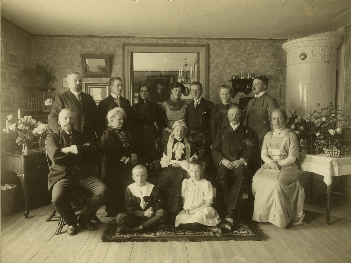 Biskopinnan Genberg, Amalia Charlotta Kristina Genberg, f. Toll. Levde 1821-1912. Bilden visar biskopinnans 90 årsdag firades med barn och övriga familjen.