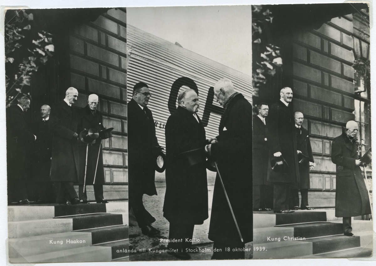 Kung Haakon VII, President Kyösti Kallio och Kung Christian X anländer till Kungamötet i Stockholm den 18 oktober 1939 mottagna av Kung Gustav V.