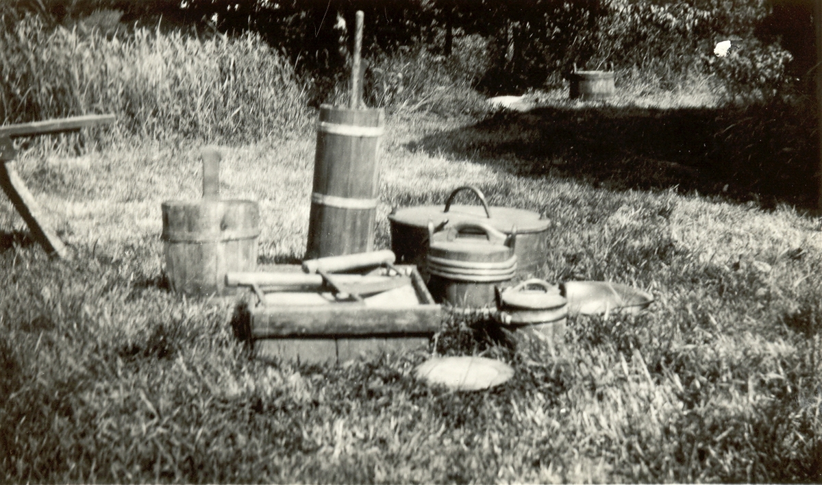 Stäva, hörna, åska, smörfat, trätallrik, träsked med snedställt skaft, hack, ho och hackknivar.