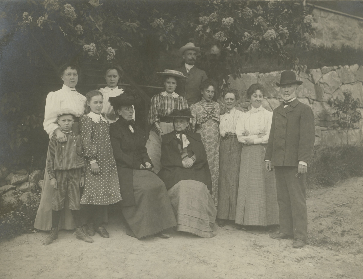 Från höger: Gustaf Leonard Ideström, Karin Lidman, Elin Lidman, Alma Lidman, Axel Ideström, Hanna Ideström gift Möllerberg, Gertrud Nordvik, Gerda Nordvik, Harald och Barbro Nordvik framför Gerda.