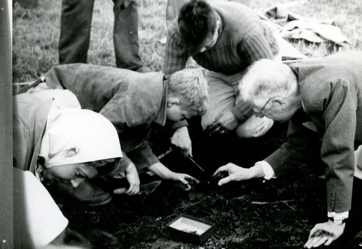 Titel: Kung Gustaf VI Adolf, som var känd för sitt intresse för arkeologi, deltog vid utgrävningarna av Skedemosse.