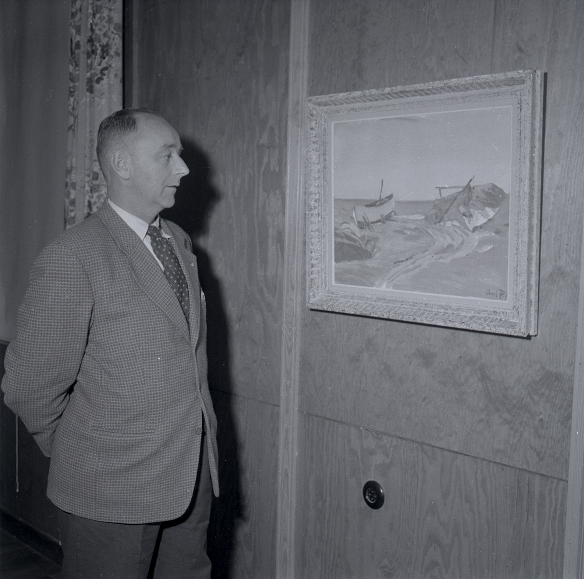Troligen Karl Viktor Herbert Prim 1910-1998 som står och tittar på en tavla. Bild ifrån nybyggda godtemplargården i Borgholm.