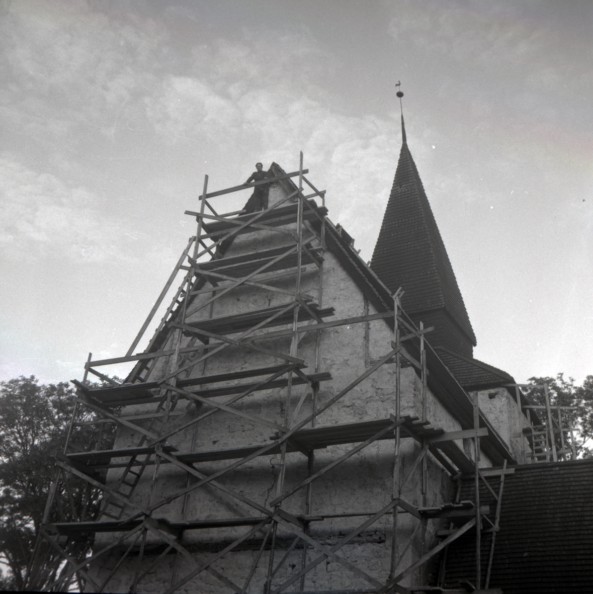 Hossmo kyrka, exteriör med byggnadställningar.
