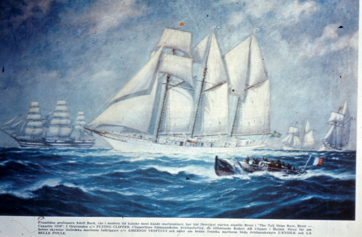 Framlidne professorn Adolf Bock, vår i modern tid kanske mest kände marinmålare har här förevigat starten utanför Brest i "The Tall Ships Race, Brest - Canaries 1958"