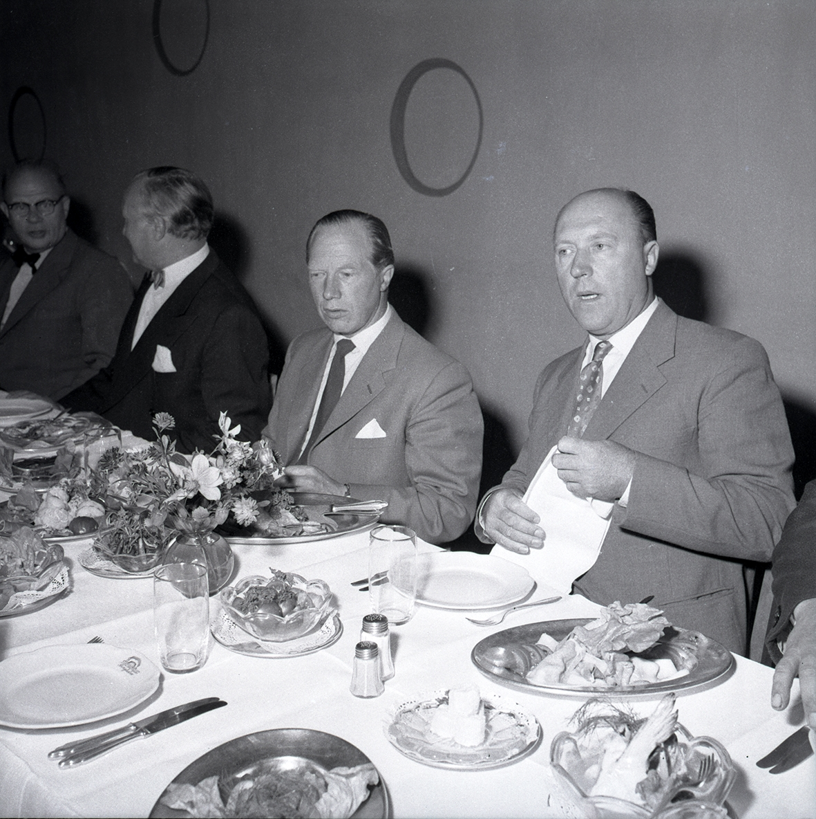 Statsrådet Eliasson i mitten. Landshövding Ruben Wagnsson till vänster i bild vid ett dukat middagsbord.