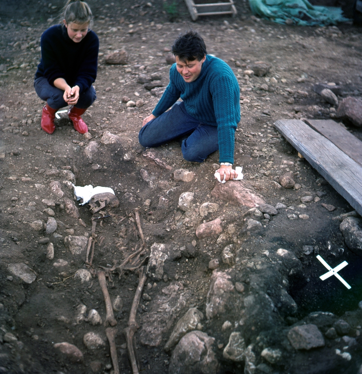Ulf Erik Hagberg vid skelettgrav på Skedemosse. Till vänster Källén?