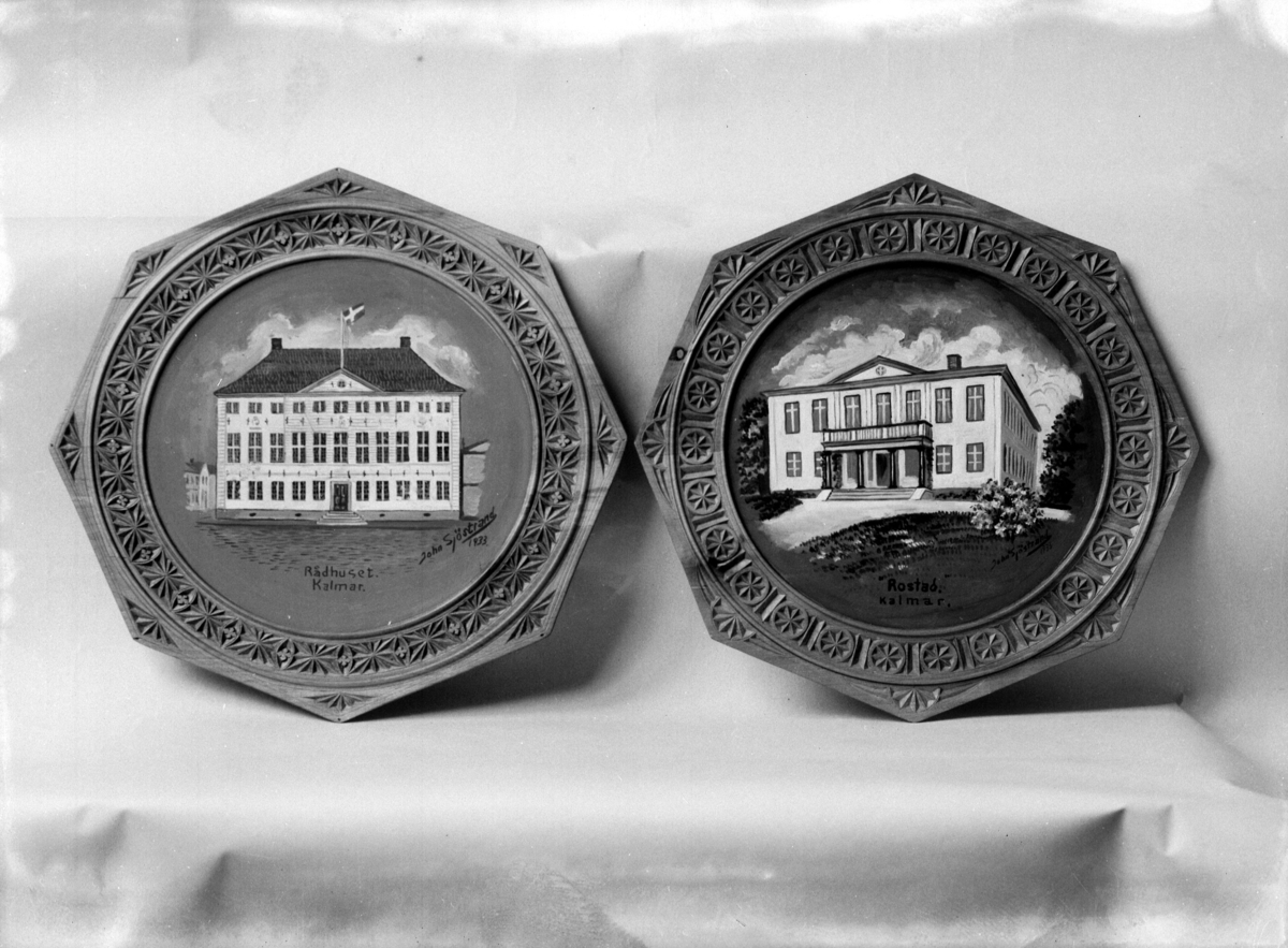 Trätallrikar med bilder av John Sjöstrand. Den vänstra visar rådhuset, men högra Rostad.