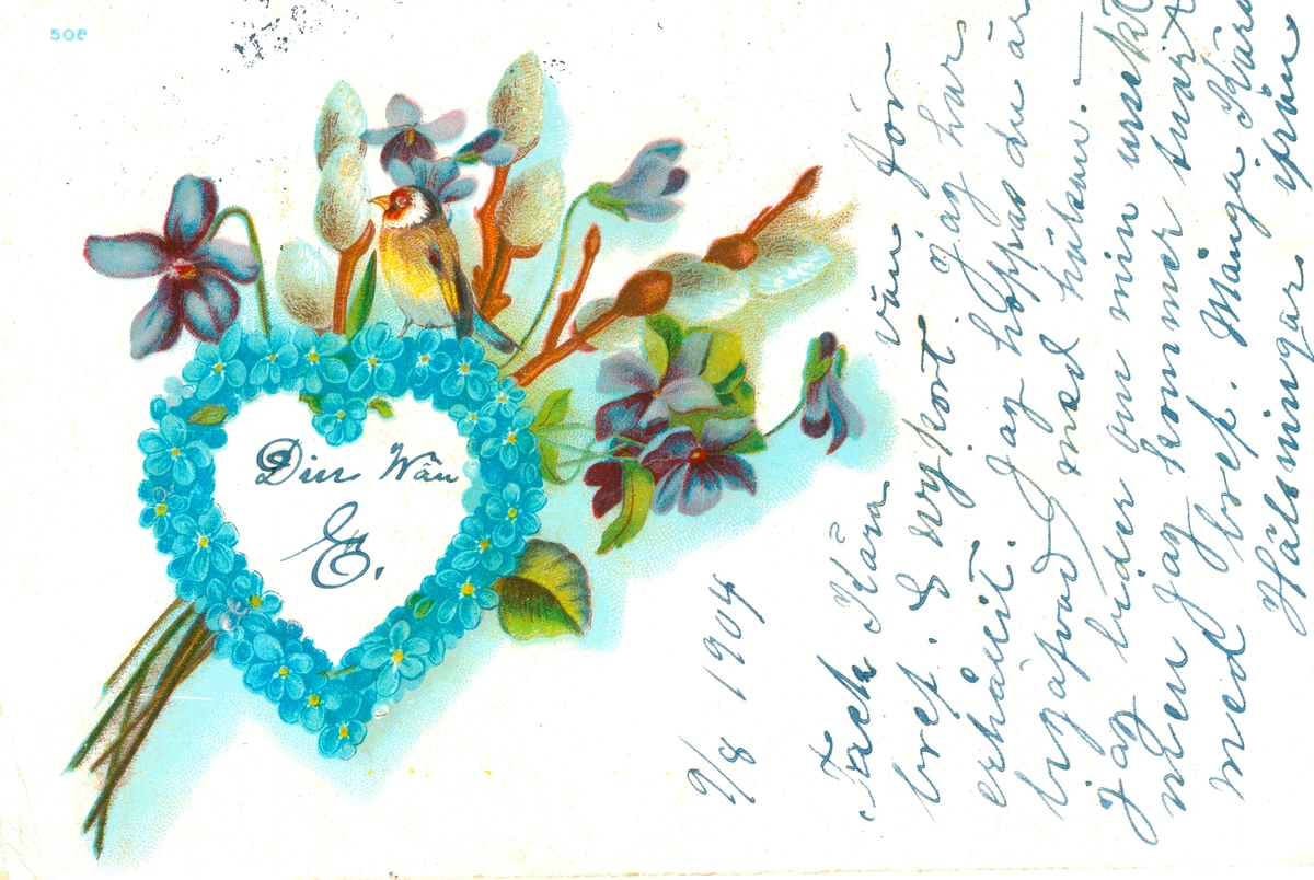Vykort skickat till Kristina Andersson född 1865 i Böda, syster till N J Andersson, när hon bodde i USA. Det är skrivet av Edvard Nilsson i Böda. På kortet har Edvard skrivit: "9/8 1904. Tack kära vän för bref och vykort jag har erhållit. Jag hoppas du är begåfvad med hälsan. Jag beder om min ursekt men jag kommer snart med bref. Många kära hälsningar ifrån din wän E."