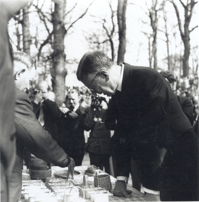 Kung Gustaf VI Adolf beskådar slöjdalster under Eriksgatan i Kalmar län. Bilden är troligen tagen i Torsås men uppgift saknas.