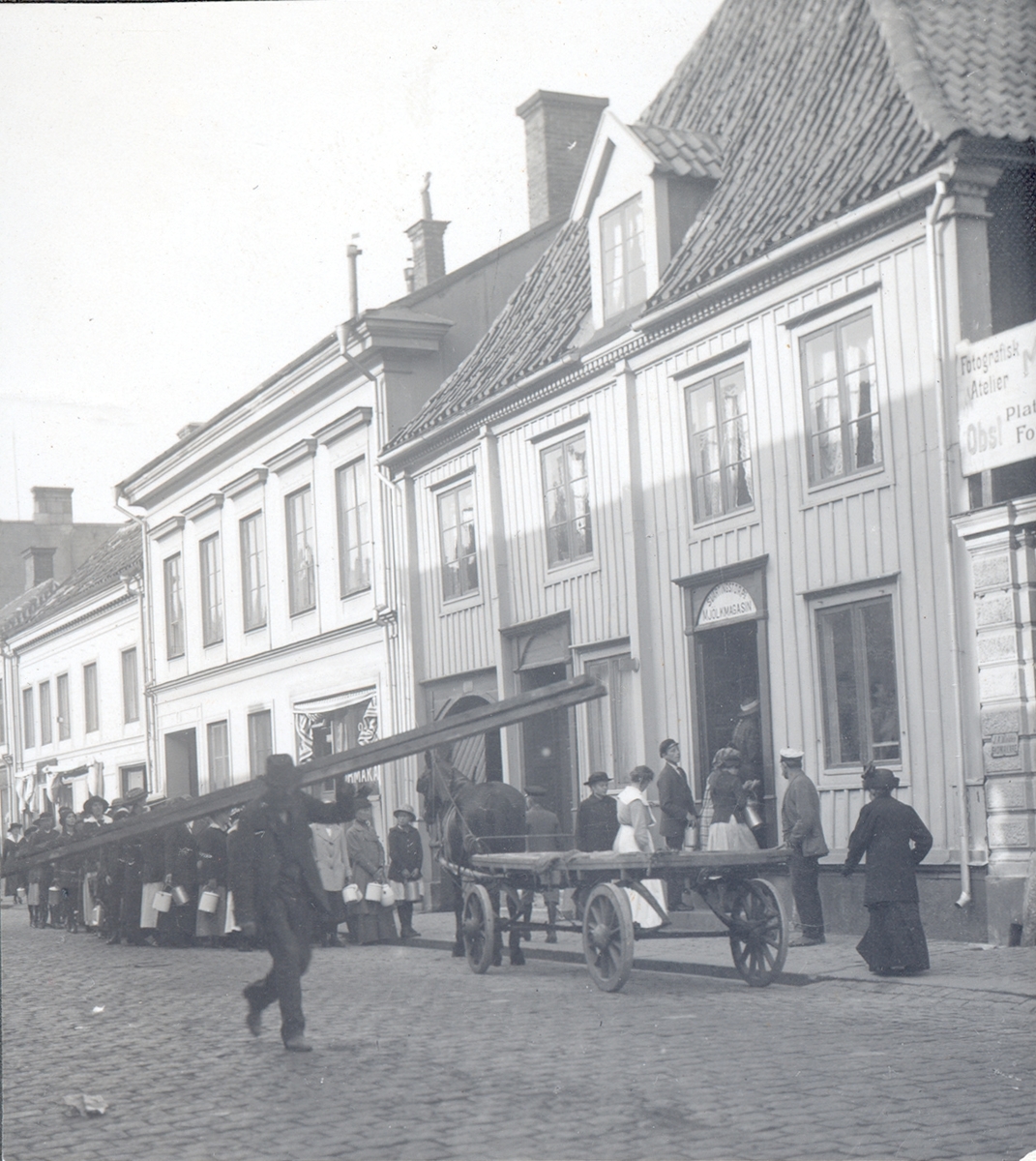 Häst och vagn på en gata i Kalmar samt en man som bär på ett par plankor i förgrunden.