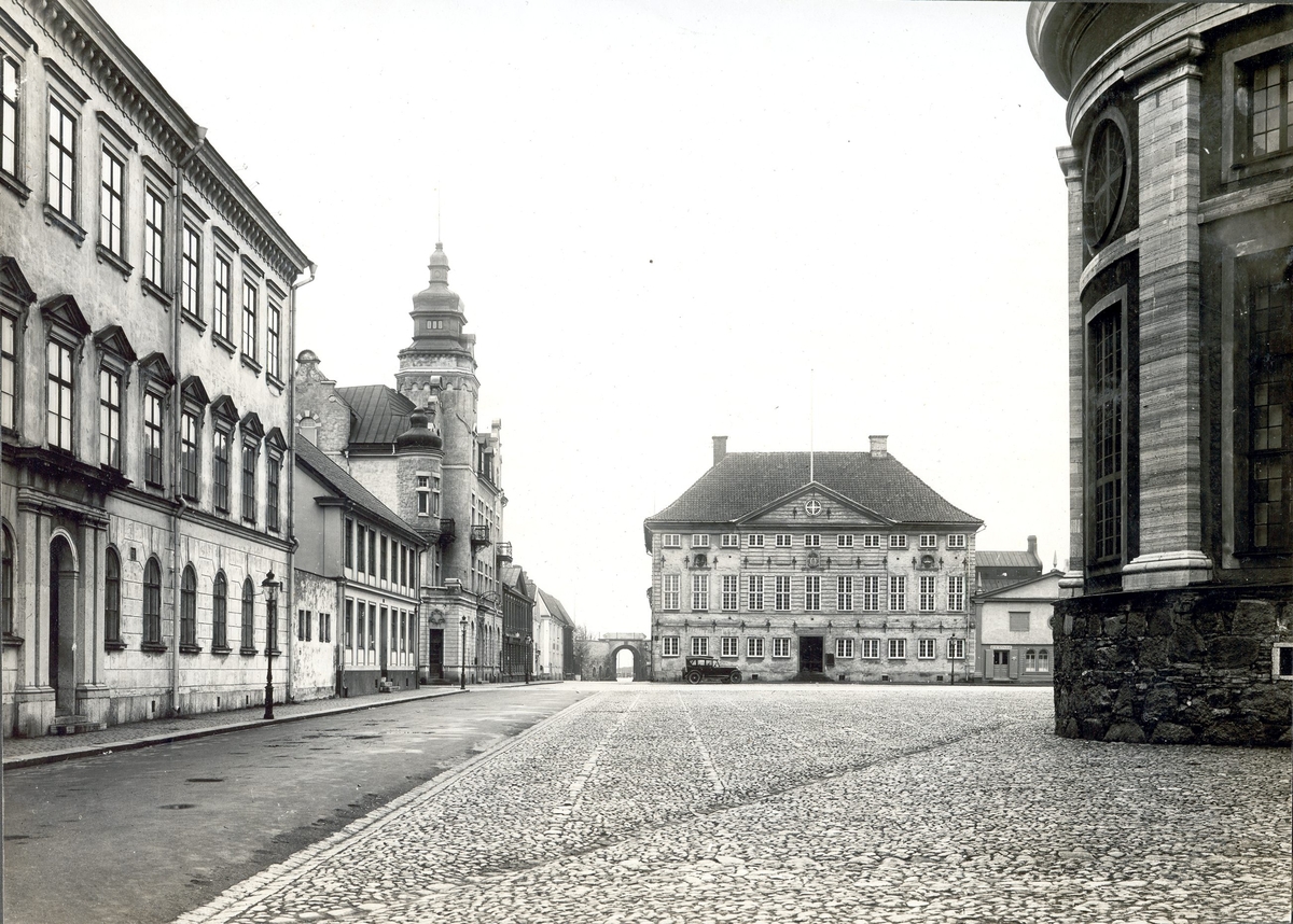 Rådhuset, del av stadshuset och del av domkyrkan i bild på Stortorget i Kalmar.