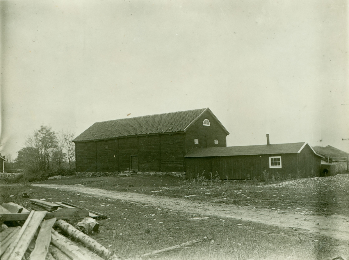 Gammalt magasin i två våningar, skiftesverk, rödfärgat.