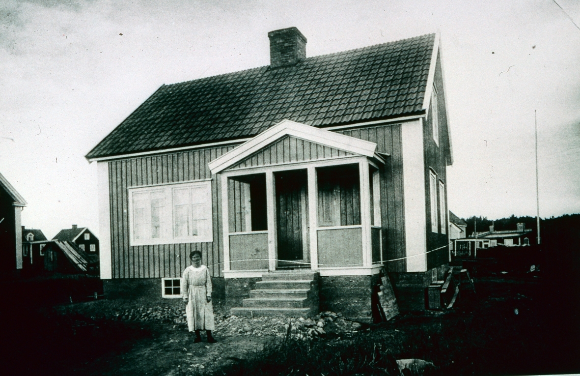 En kvinna framför ett hus i kvarteret Getingen 15.