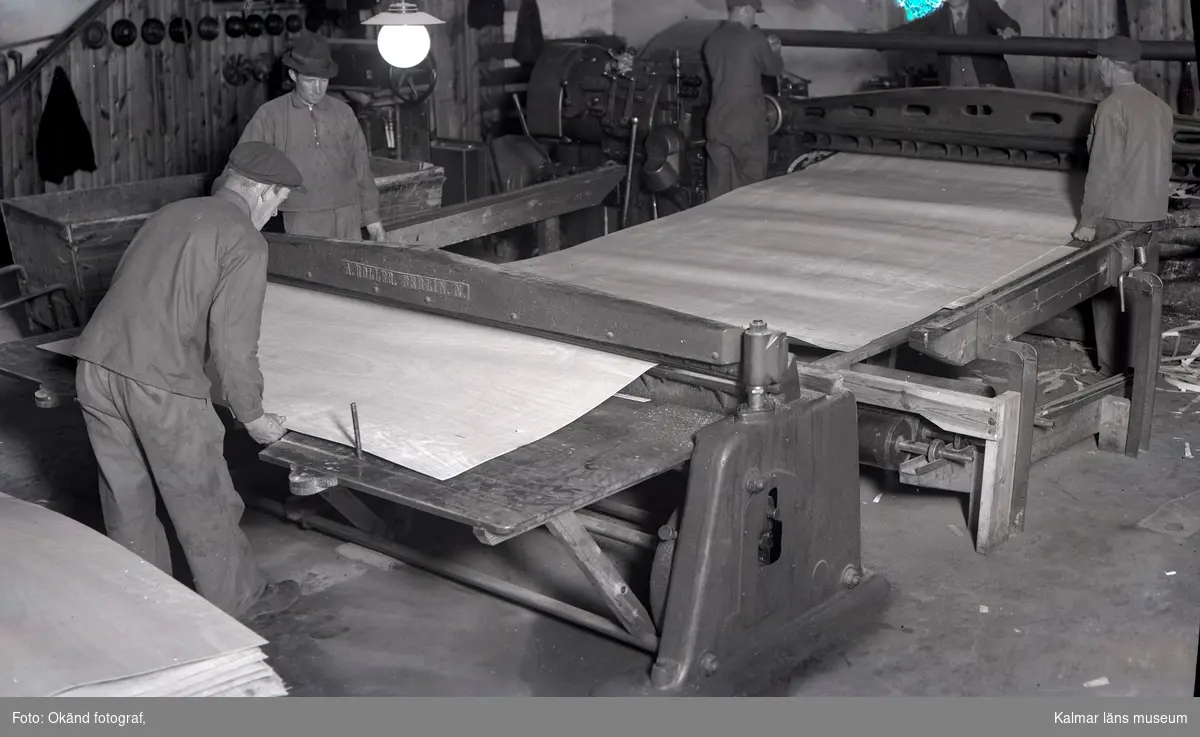 Folk som arbetar med träbearbetning. Bohman & Johanssons fanérfabrik, Blomstermåla.