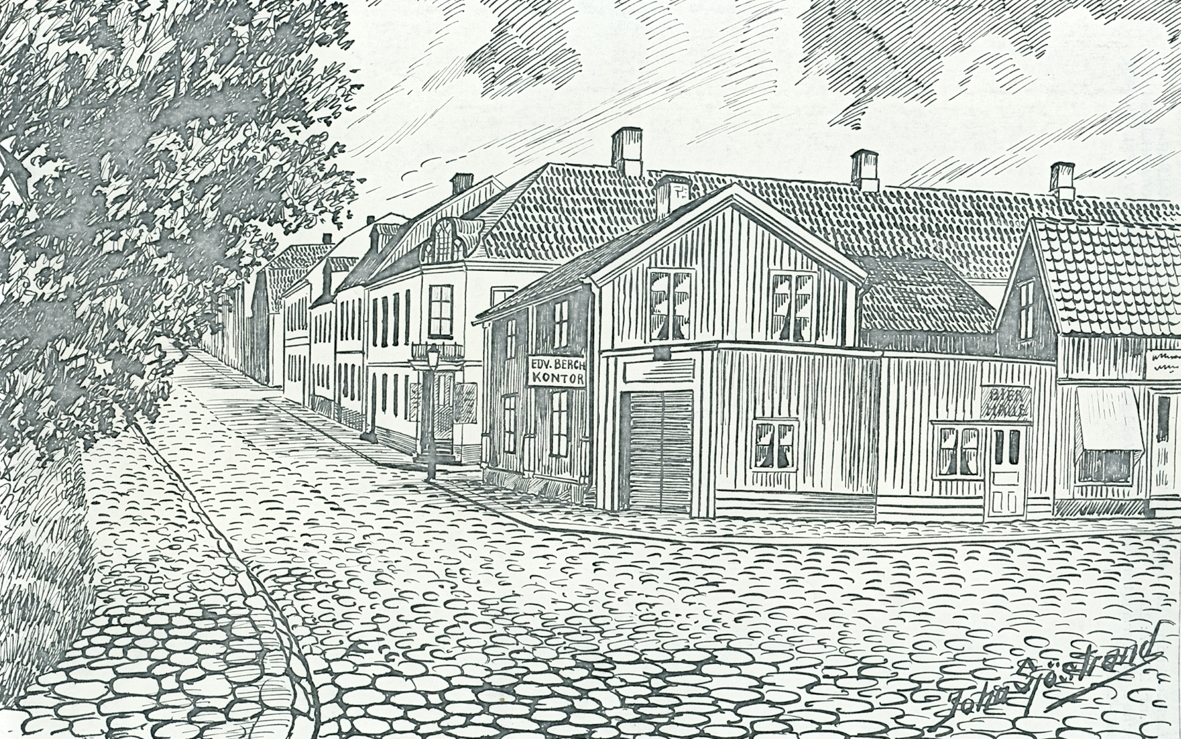 Tuschteckning av John Sjöstrand. Hörnet av Larmgatan och Västra Sjögatan 1880-tal.