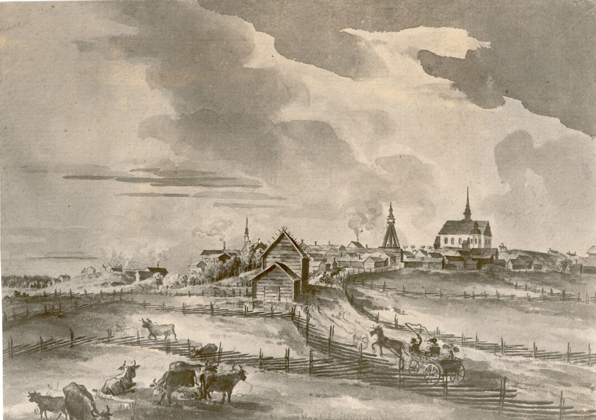 Akvarell, som visar en landsväg och by med kyrka. Vägen till Vimmerby?