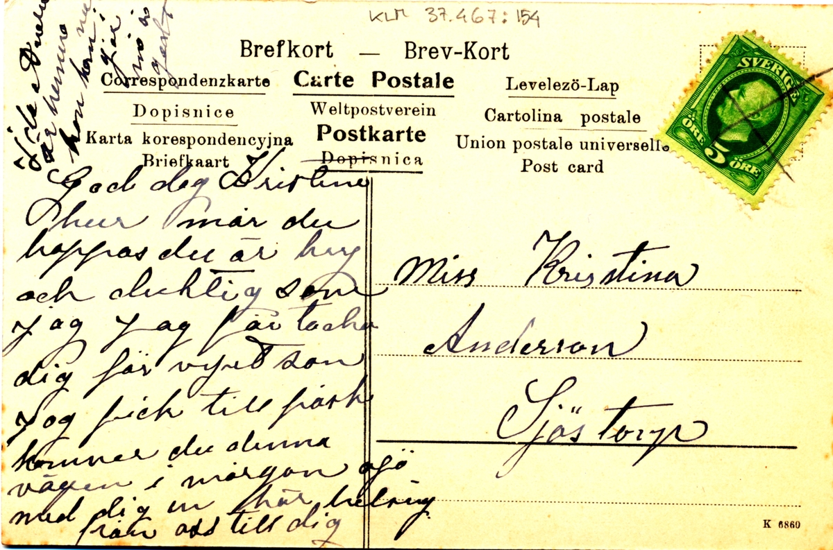 Ett vykort till Miss Kristina Andersson, Sjötorp.
