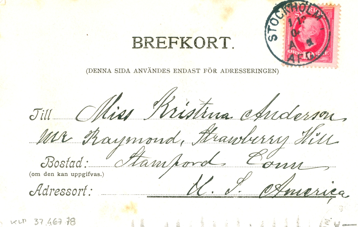 Ett vykort till Kristina Nilsson, Stamford, Connecticut, USA från Edvard Nilsson i Böda.