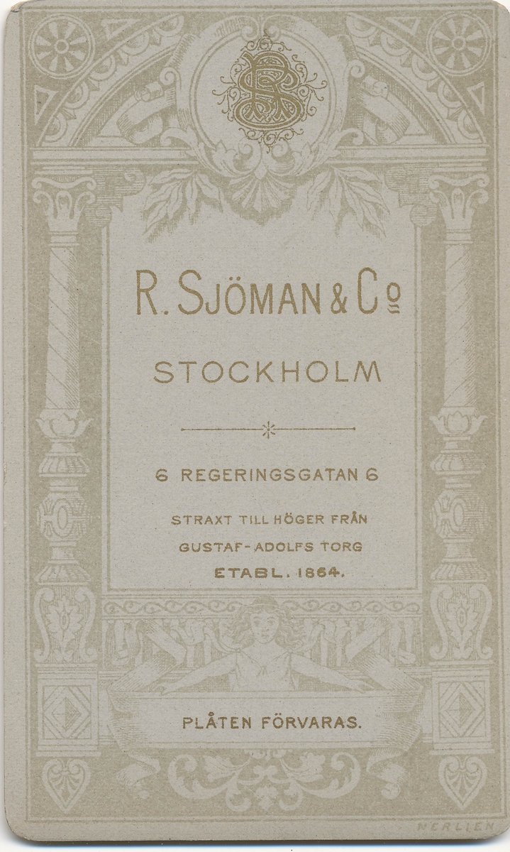 Tryckt text på baksidan av fotot: "R Sjöman & Co Stockholm 6 Regeringsgatan 6 Straxt till höger från Gustaf-Adolfs Torg Etabl. 1864."