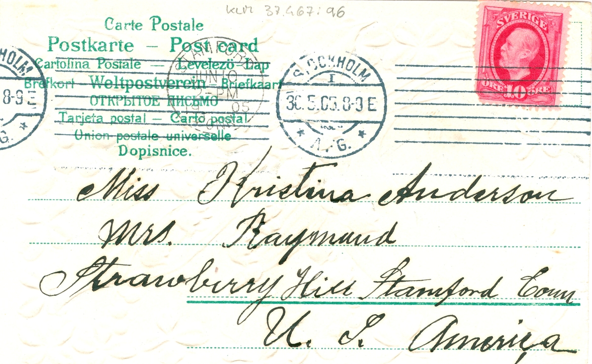 Ett vykort i färg, stående format, till Kristina Andersson, Stamford, Connecticut, USA. Det är skrivet av Edvard Nilsson i Böda.