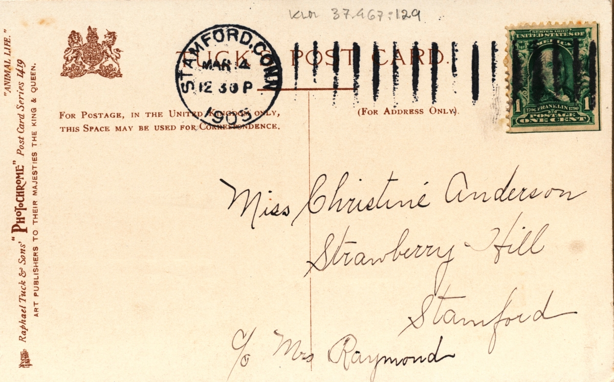 Ett vykort i färg, liggande format, till Christine Anderson, Strawberry Hill, Stamford, c/o Mrs Raymond från Alice. Kortet är stämplat i Stamford 1905