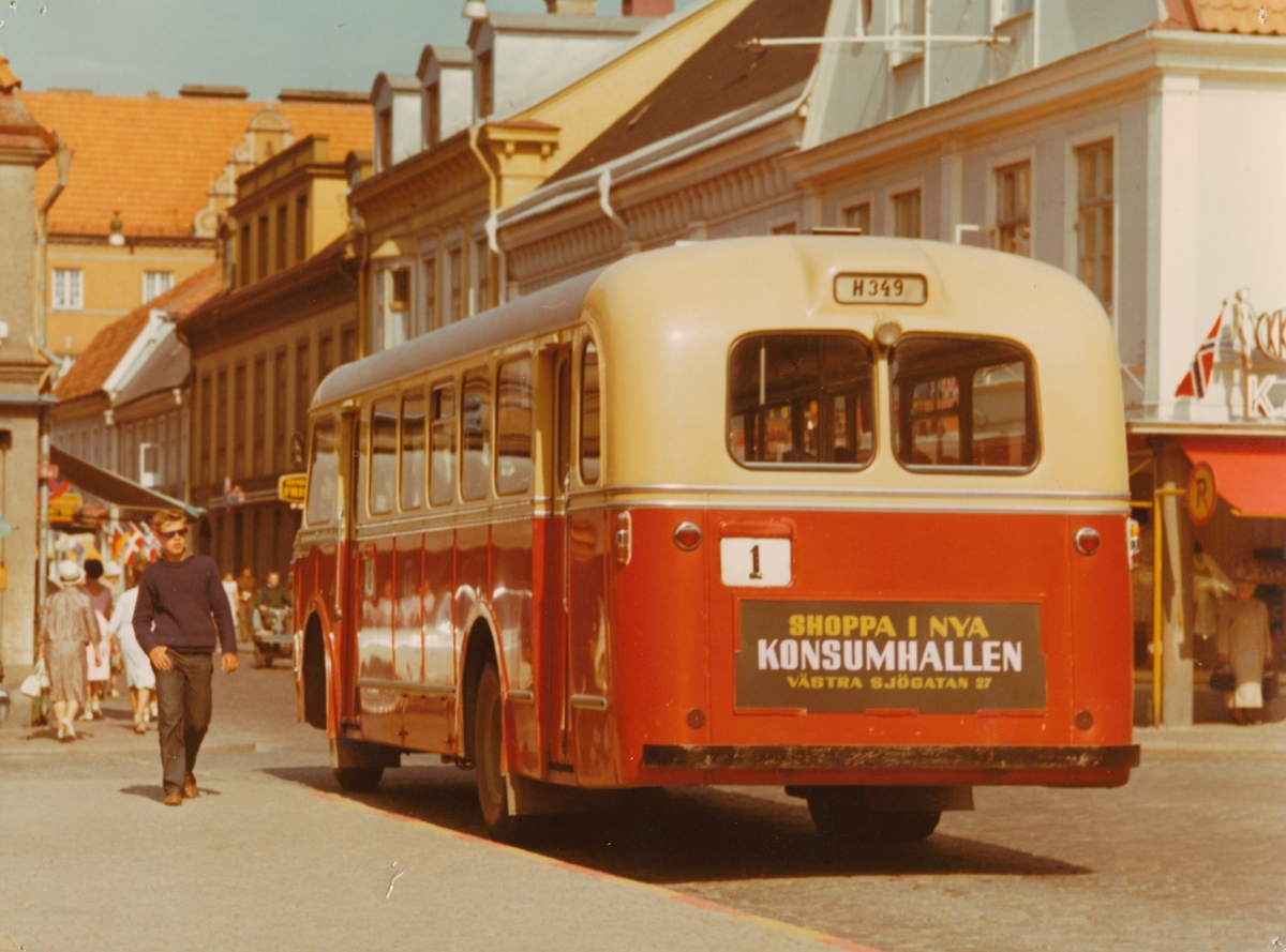 Buss med reklam för Konsumhallen på Västra Sjögatan.