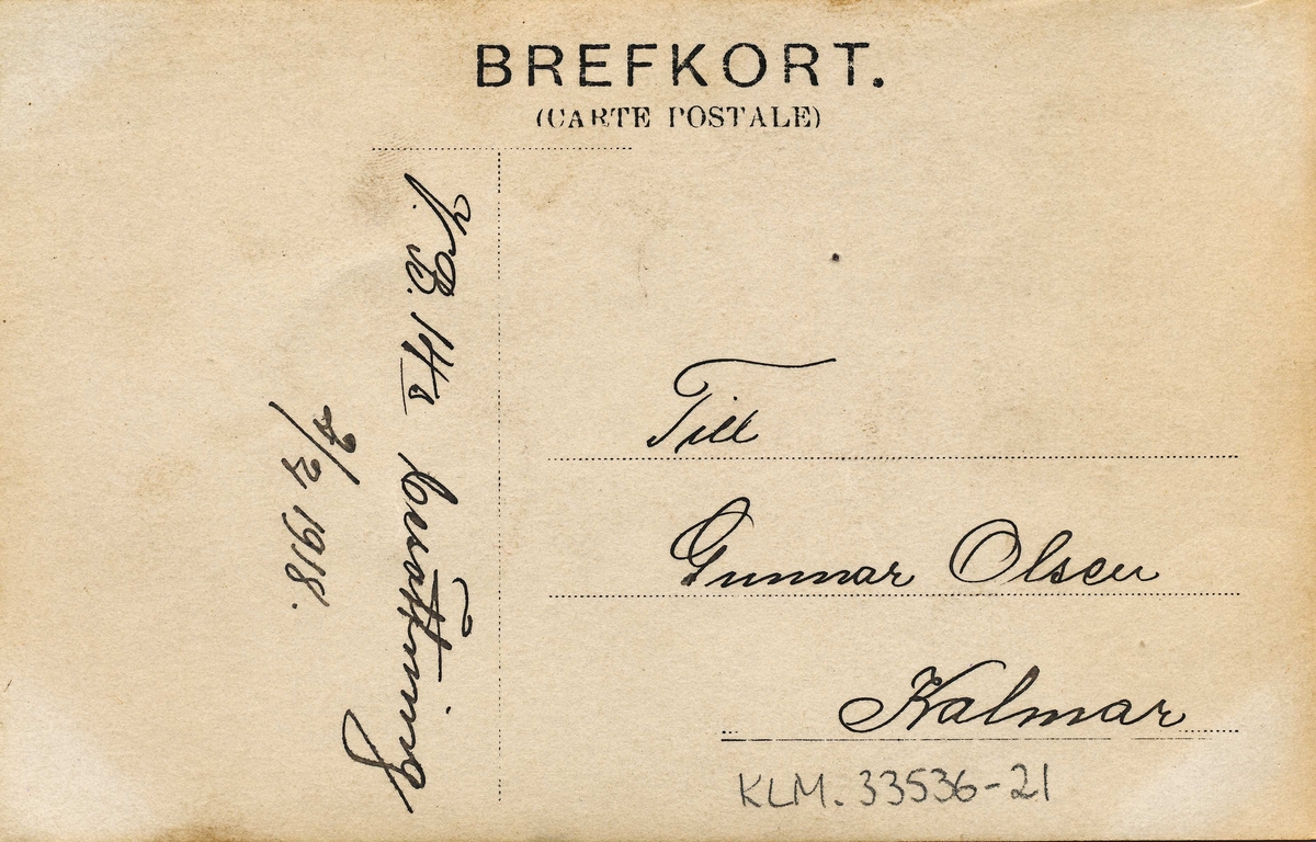 "Till Gunnar Olsen Kalmar V. B. 14s besättning 2/4 1918."