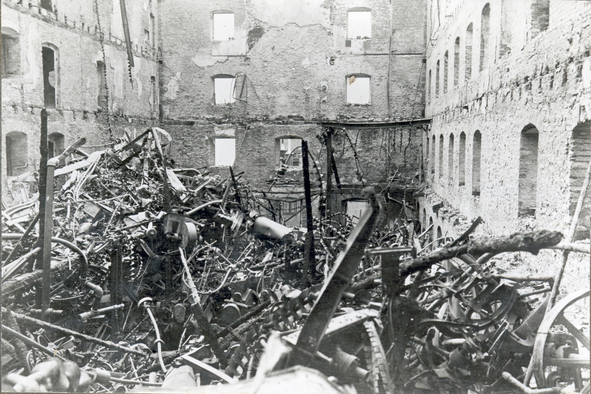 Titel: Efter Ångkvarnsbranden 1935-07-06. Det nyinstallerade kvarnmaskineriet smälte och föll våning för våning. När brandplatsen svalnat kunde man konstatera att allt som återstod var förvridet skrot.