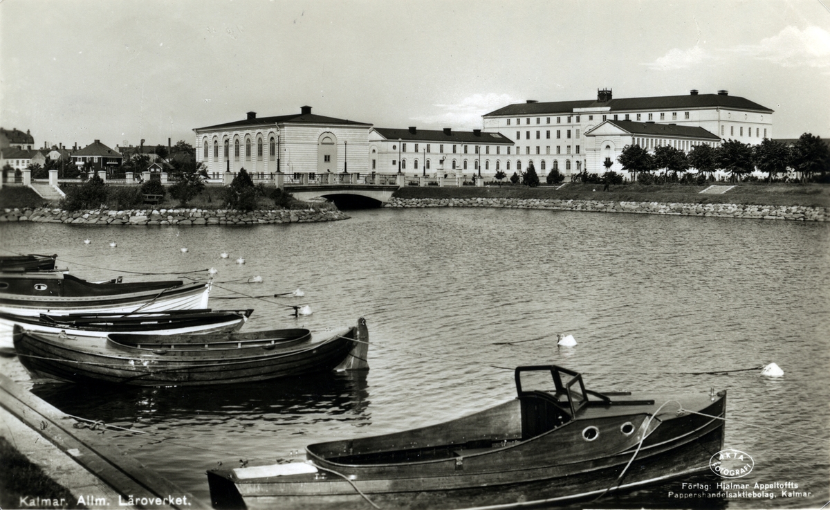 Kalmar högre läroverk (senare Stagneliusskolan) och fritidsbåtar längs Södra Kanalgatan. Dessa båtplatser avskaffades när den nya, lägre Ängöbron byggdes.