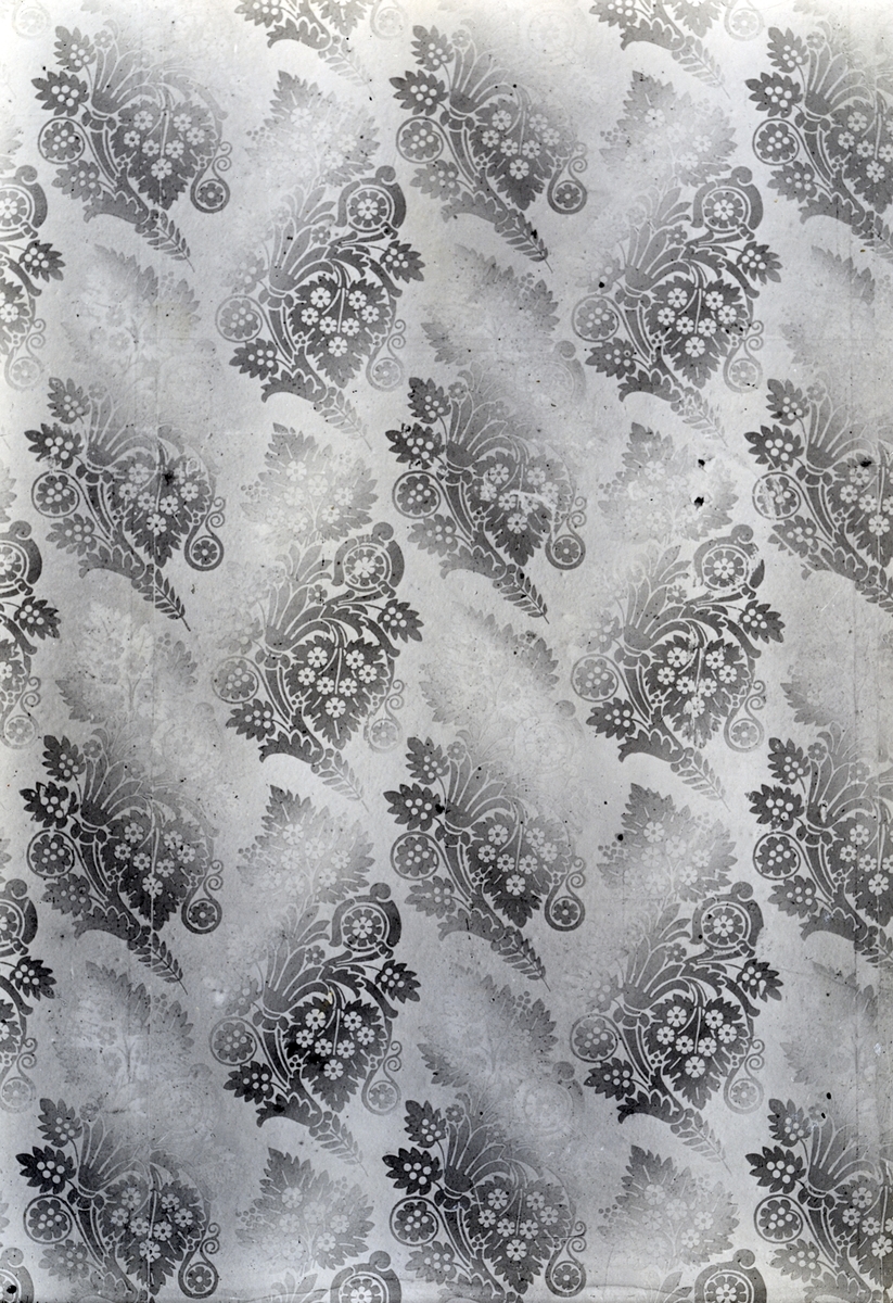 Berga herrgård. Lilla matsalen i bottenvåningen. Tapet tryckt på arkpapper, ytmönster med bladkvistar i enhetlig grå, något grönaktig färg med starka ljusskiftningar, ganska blank yta och tydligen tunnt papper. Möjligen fransk och tryckt i rulle.